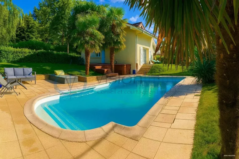 Un véritable décor exotique entoure la maison grâce à plus de 20 palmiers de 6 à 7 mètres, offrant une atmosphère rare dans la région.