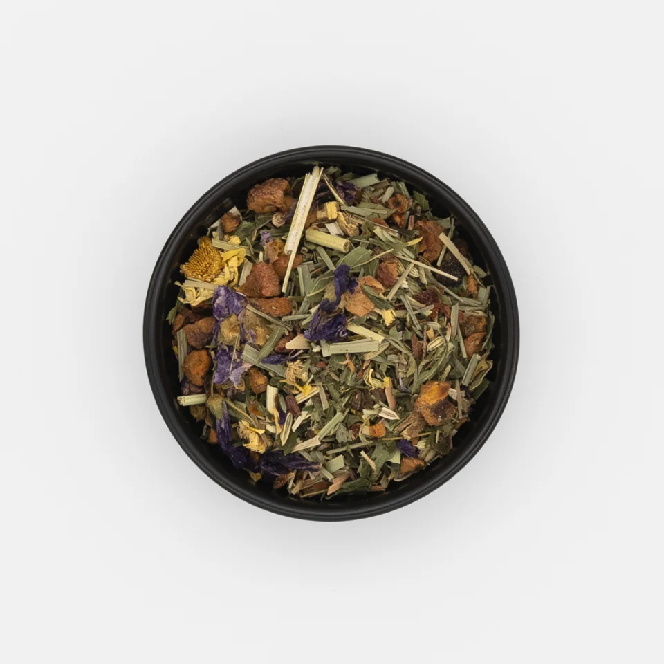 Pomme*, citronnelle*, chanvre*, fenouil*, écorces de cacao*, réglisse*, cynorrhodon*, ortie*, souci*, cannelle*, mauve*, menthe*
