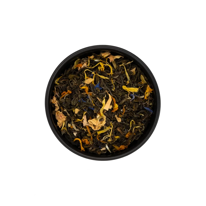 Ce thé délicieusement équilibrée marie l'harmonie du thé vert et du thé blanc, infusée avec de la rose, du souci, du pamplemousse, du tournesol et du bleuet pour une palette de couleurs et de saveurs inoubliable.