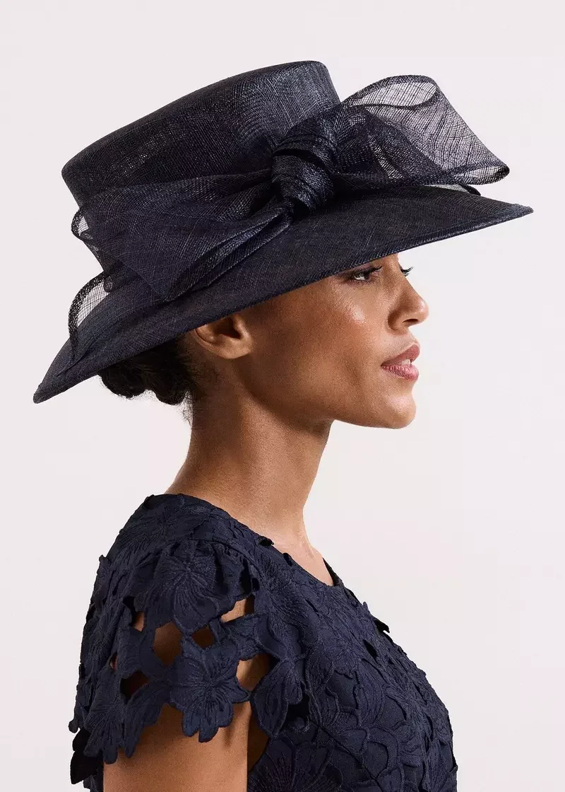 Faites sensation lors de cette saison des événements. Ce chapeau bleu marine à larges bords, orné d'un joli nœud, est l'accessoire idéal pour la robe de la mère de la mariée ou du marié. Des accessoires bleu marine complètent parfaitement la tenue.