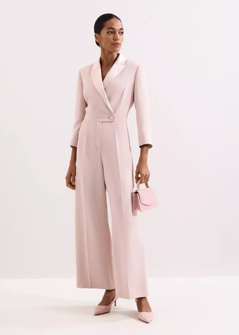 Cette combinaison incarne le raffinement et le design soigné. Notre combinaison Mirella, d'un rose féminin, s'inspire du style smoking classique. Avec ses manches trois-quarts, son revers pointu et ses pinces savamment placées qui structurent la silhouette, vous pouvez l'accessoiriser pour créer une tenue inoubliable, idéale pour les grandes occasions, que vous porterez avec plaisir pendant des années.