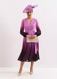Découvrez la robe Mira, une pièce d'exception qui ne manquera pas de faire sensation. Avec son élégant dégradé de couleurs, cette robe midi est entièrement plissée pour un effet maximal et une fluidité parfaite. Agrémentée d'une patte de boutonnage sur le corsage et d'une ceinture chaîne contemporaine, elle se marie à merveille avec des accessoires dorés assortis pour une tenue coordonnée.