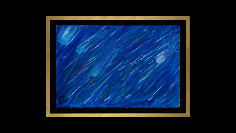 Peinte avec de l'acrylique sur feuille de coton à l'aide de pinceaux, cette œuvre évoque une pluie de quatre comètes traversant un ciel étoilé au cœur de l'univers.