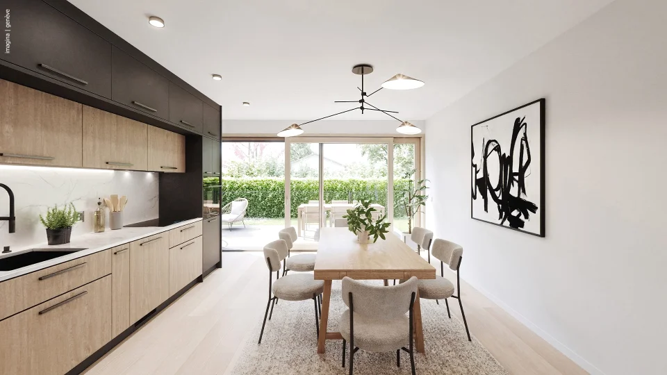 The modern kitchen, impeccably finished, opens onto a bright living room.